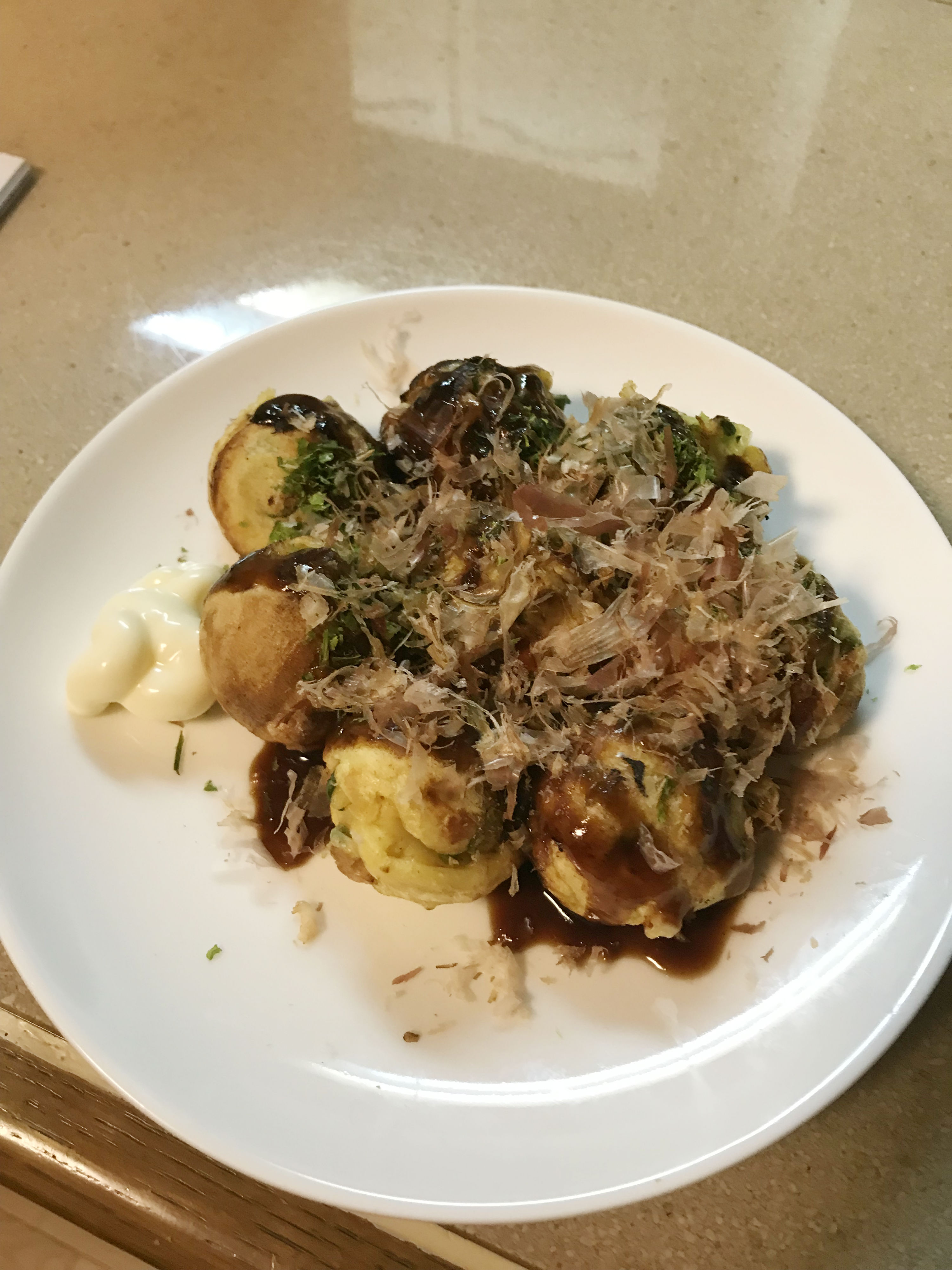 上に鰹節、青のり、ソース、マヨネーズまで添えてしっかりと偽装工作できたかと思いきや、一番手前のたこ焼きに微妙な空間が空いておりました・・・