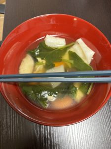 昆布と鰹で出汁を取りました。鶏肉とほうれん草など入れてさっぱりした味です。